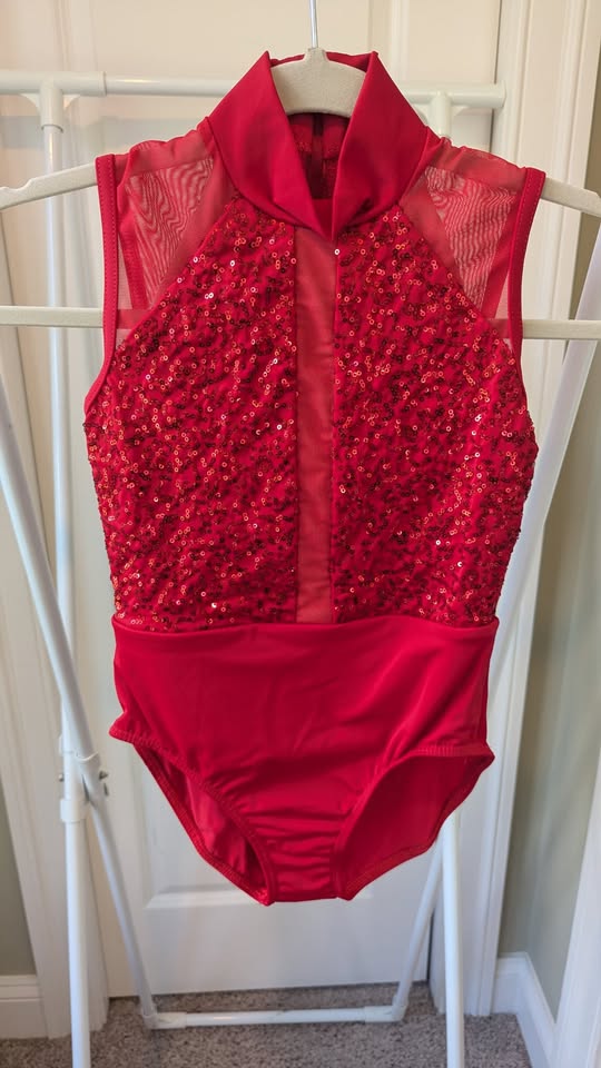 SA Preloved Solo Red Sequin Cut Out Leotard Zip Up Back Size SA