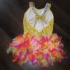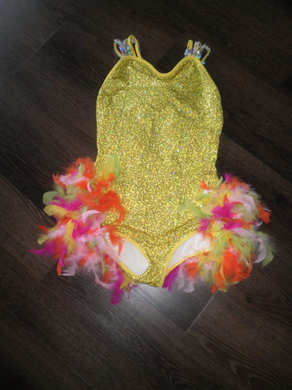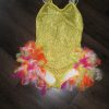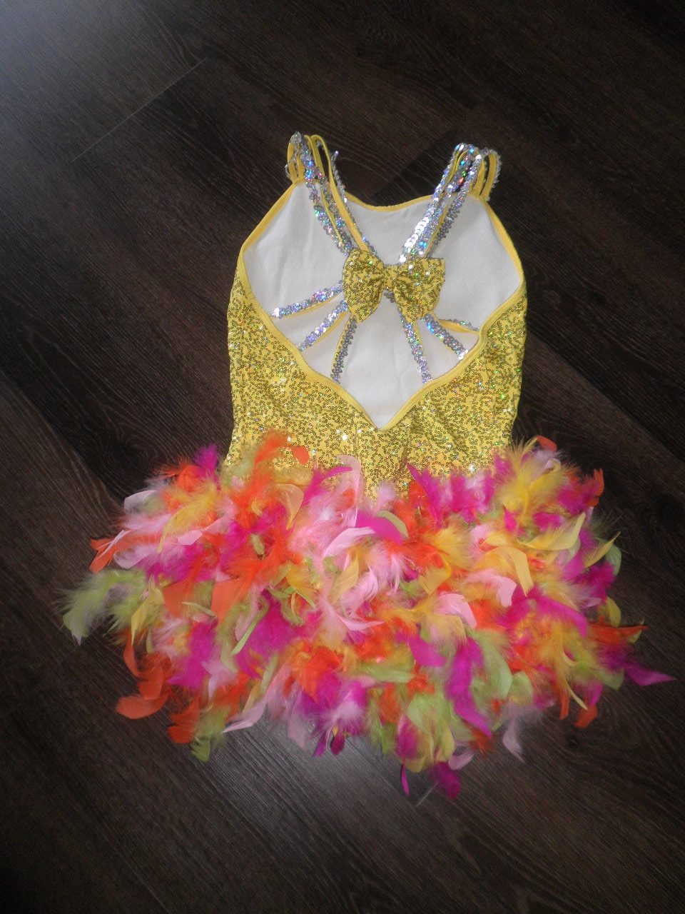 SA Preloved Solo Stage Boutique Yellow Sequin Feather Back Bustle Size SA